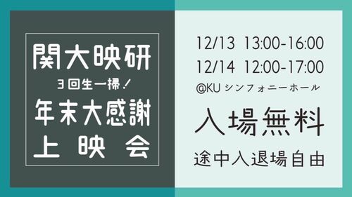 はじめに どうも、映画研究部3年の大矢です。 少し遅くなりましたが、先月の11月16日、僕が委員長を務めた第8回関西学生映画祭が終了いたしましたので、今回はそのご報告をしようと思います!お時間がある方は、ぜひ最後までお楽しみください!! 関西学生映…